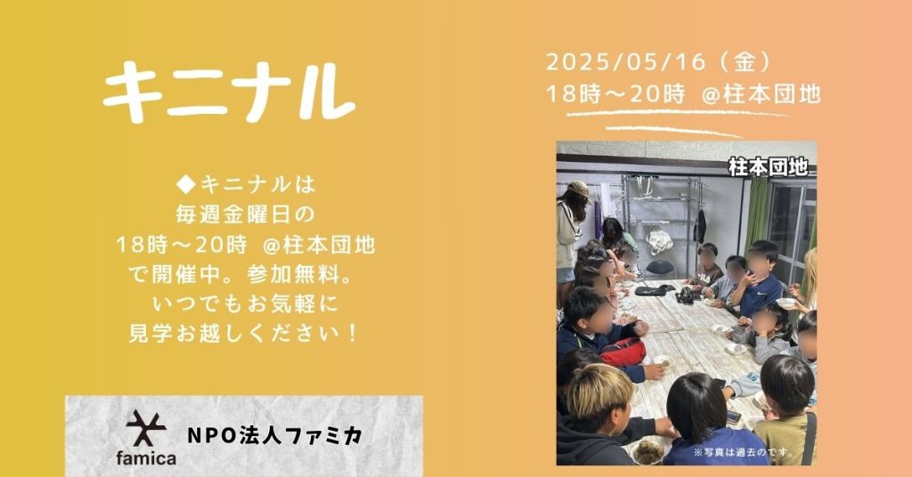 キニナルは、柱本団地で毎週金曜日の18時~20時開催しております。