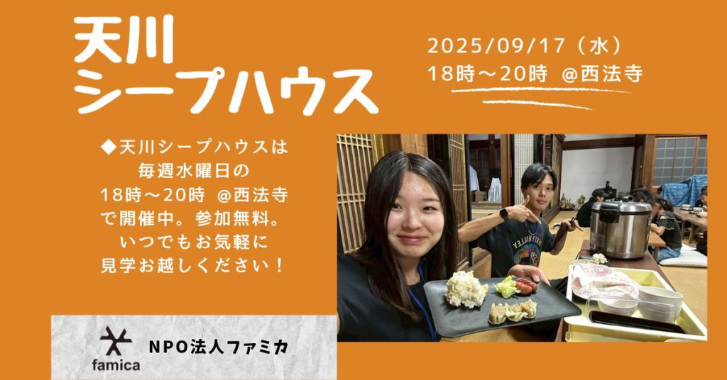 天川シープハウスは、西法寺で毎週水曜日の18時~20時開催しております。
