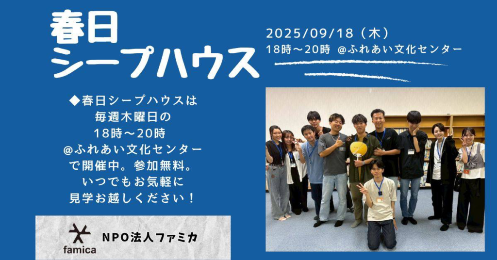 春日シープハウスは、ふれあい文化センターで毎週木曜日の18時~20時開催しております。